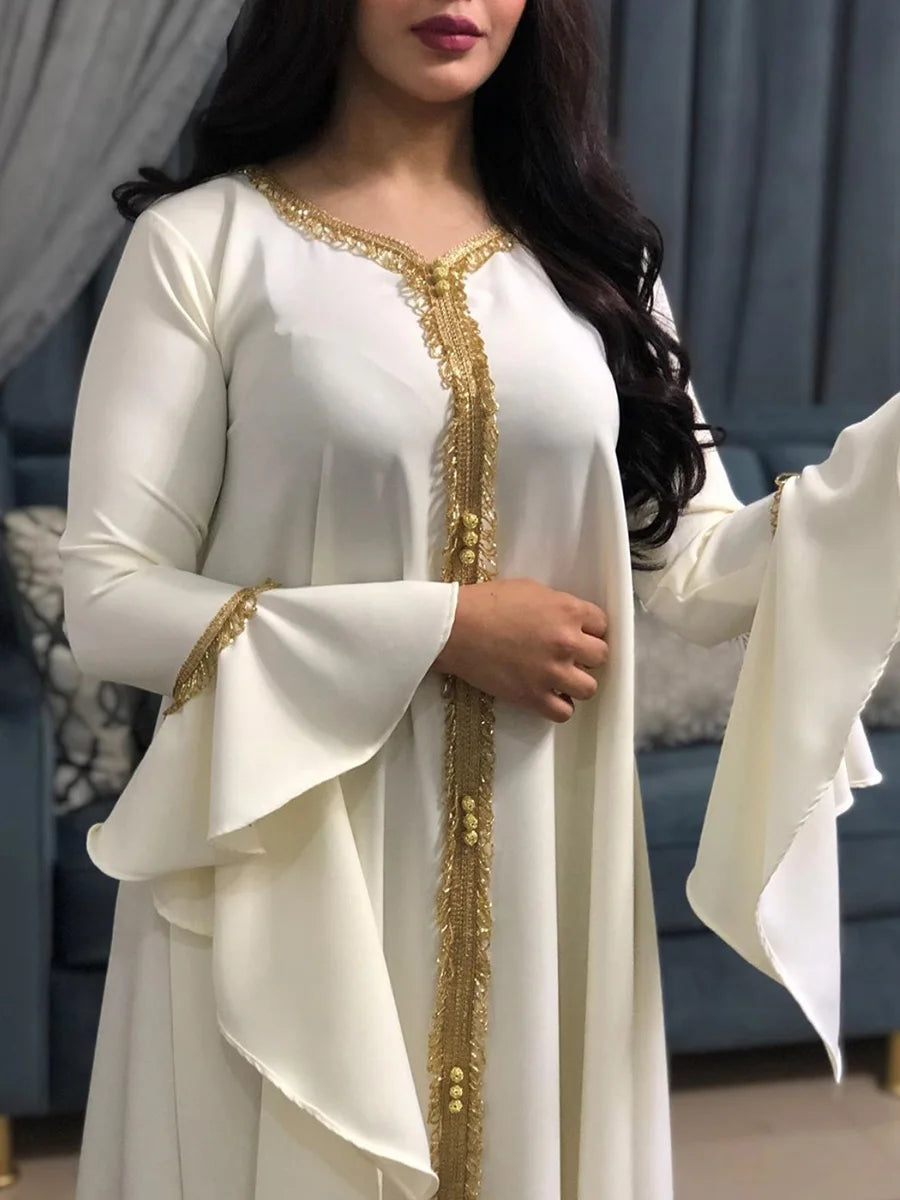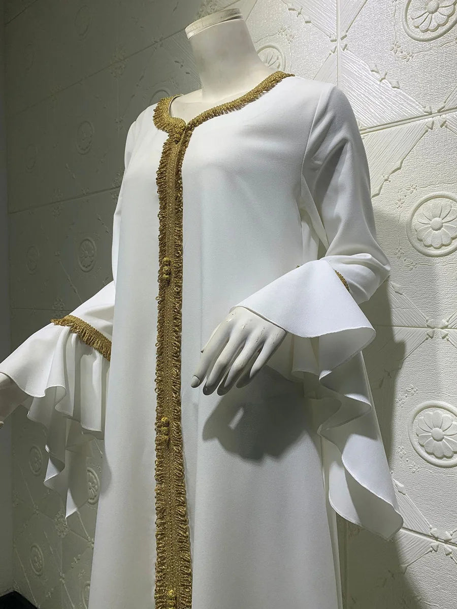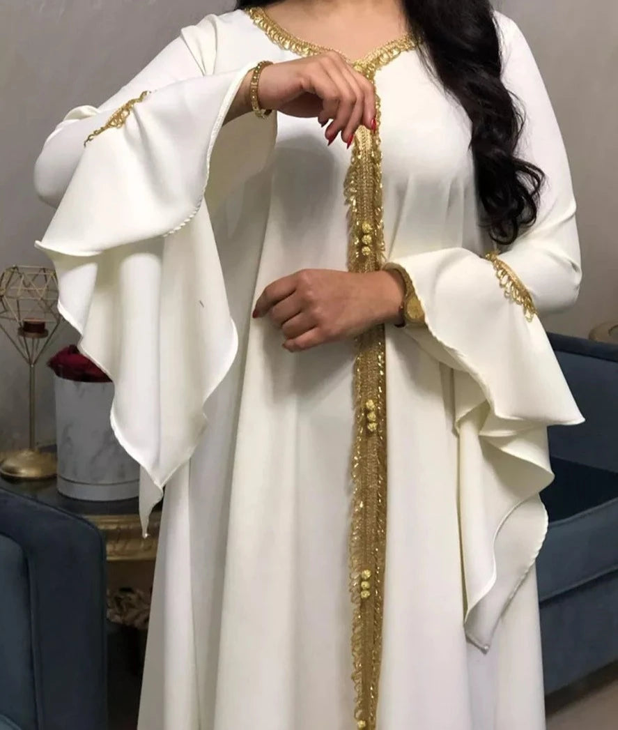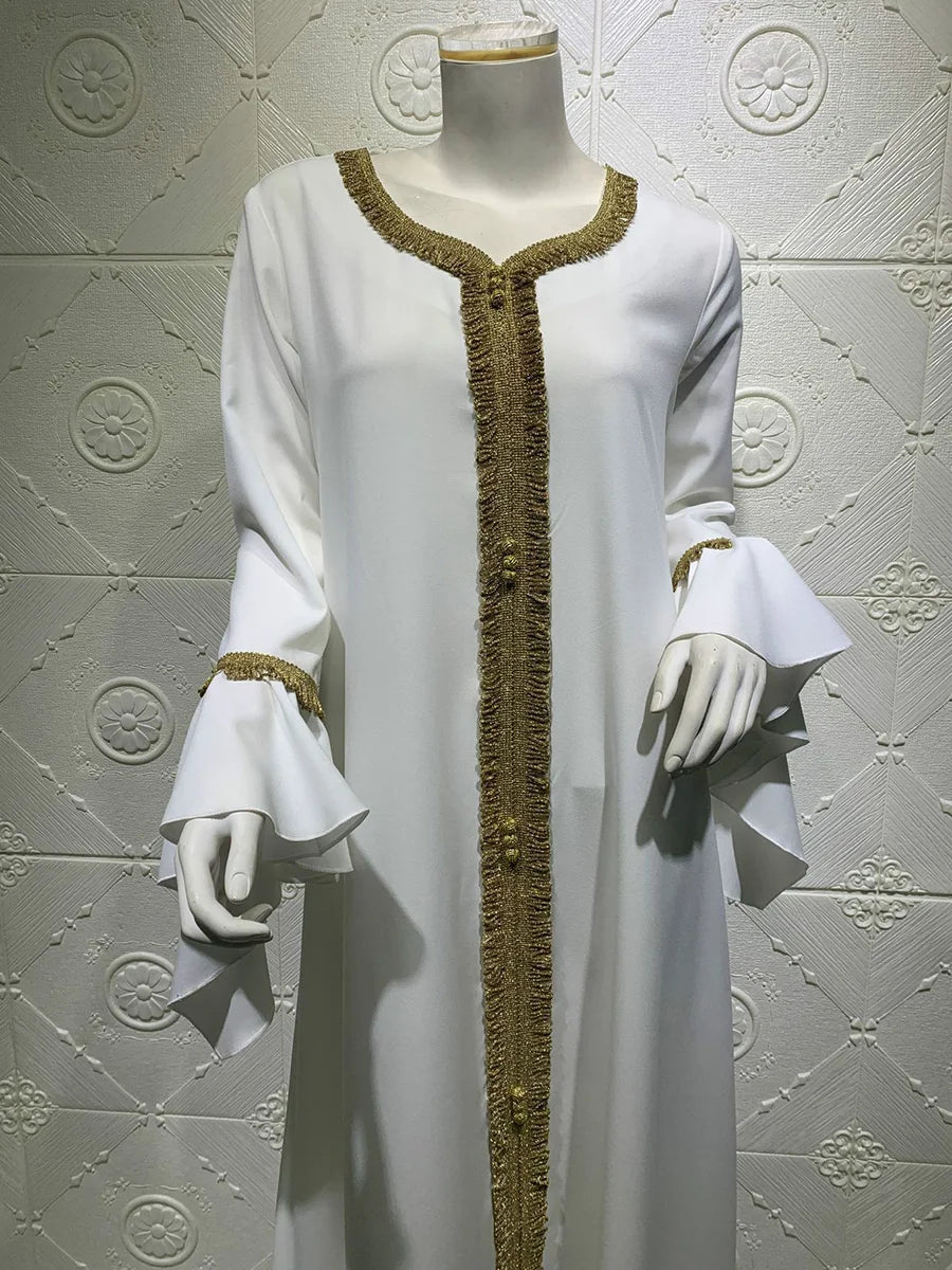 Dress iskakia Jalabiya Kaftan Dress For Women Dubai Turkey Golden Ribbon Embroidery Loose Muslim Arabic Islamic Clothing White 2020