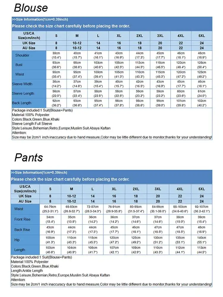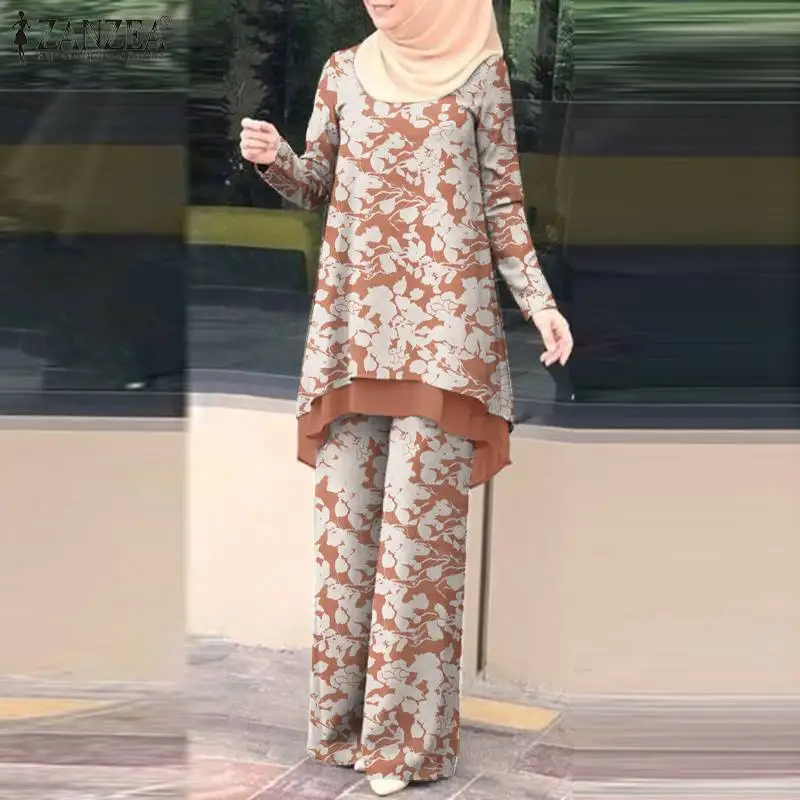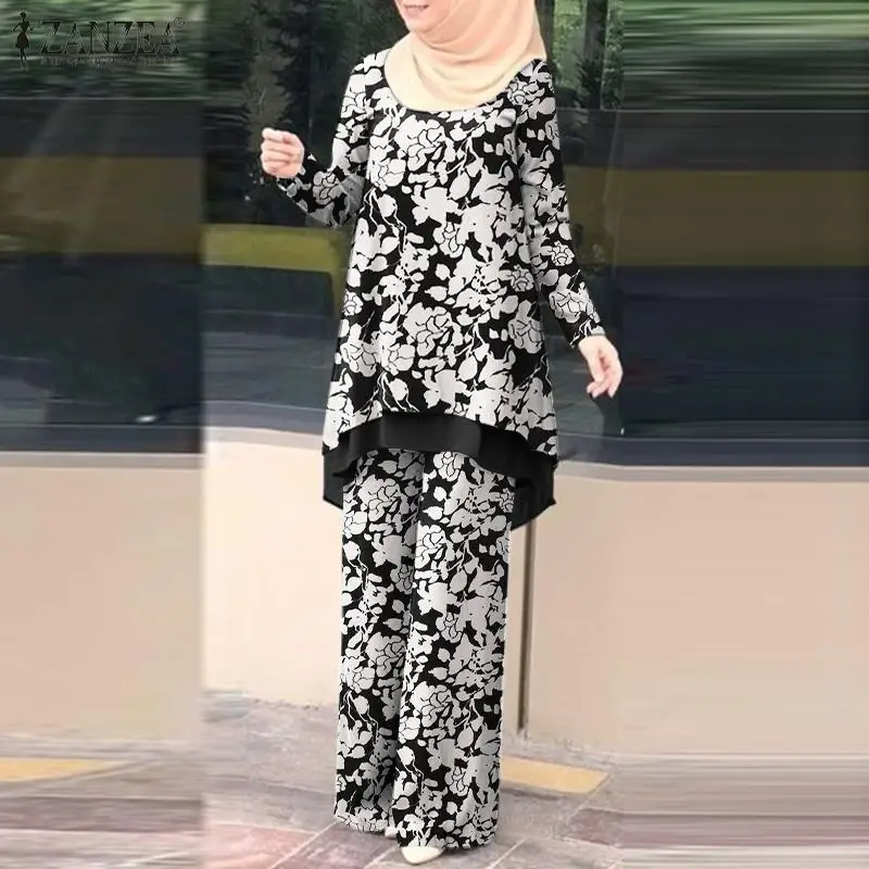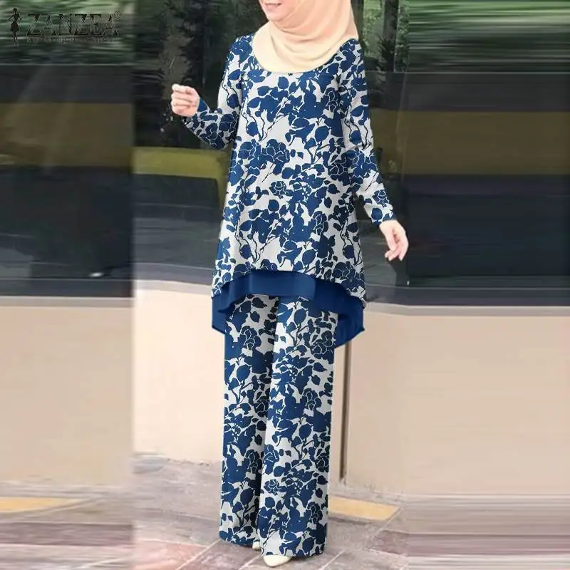 2 Piece Sets Women Islamic Clothing Vintage Floral Printed Shirt Suits Holiday Matching Sets Autumn Muslim Pant Sets